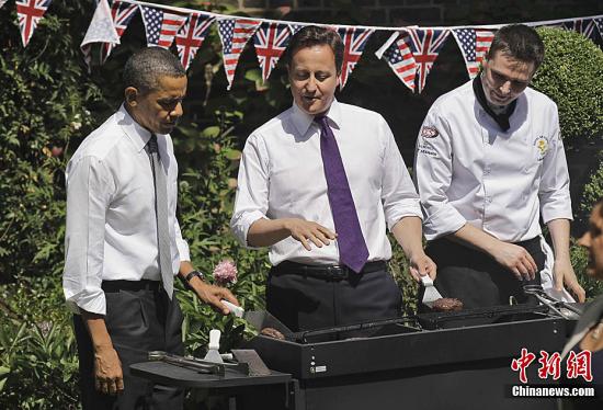 资料图片:美国总统奥巴马和英国首相卡梅伦携夫人在唐宁街10号举行了烧烤餐会。