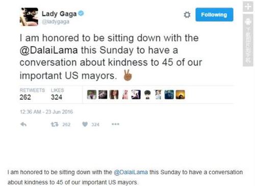 Lady Gaga在个人Twitter账号上@达赖喇嘛说,“我很荣幸自己本周日能够与达赖喇嘛一起围绕善行话题进行讨论”,同时她还转推了达赖喇嘛的推文。