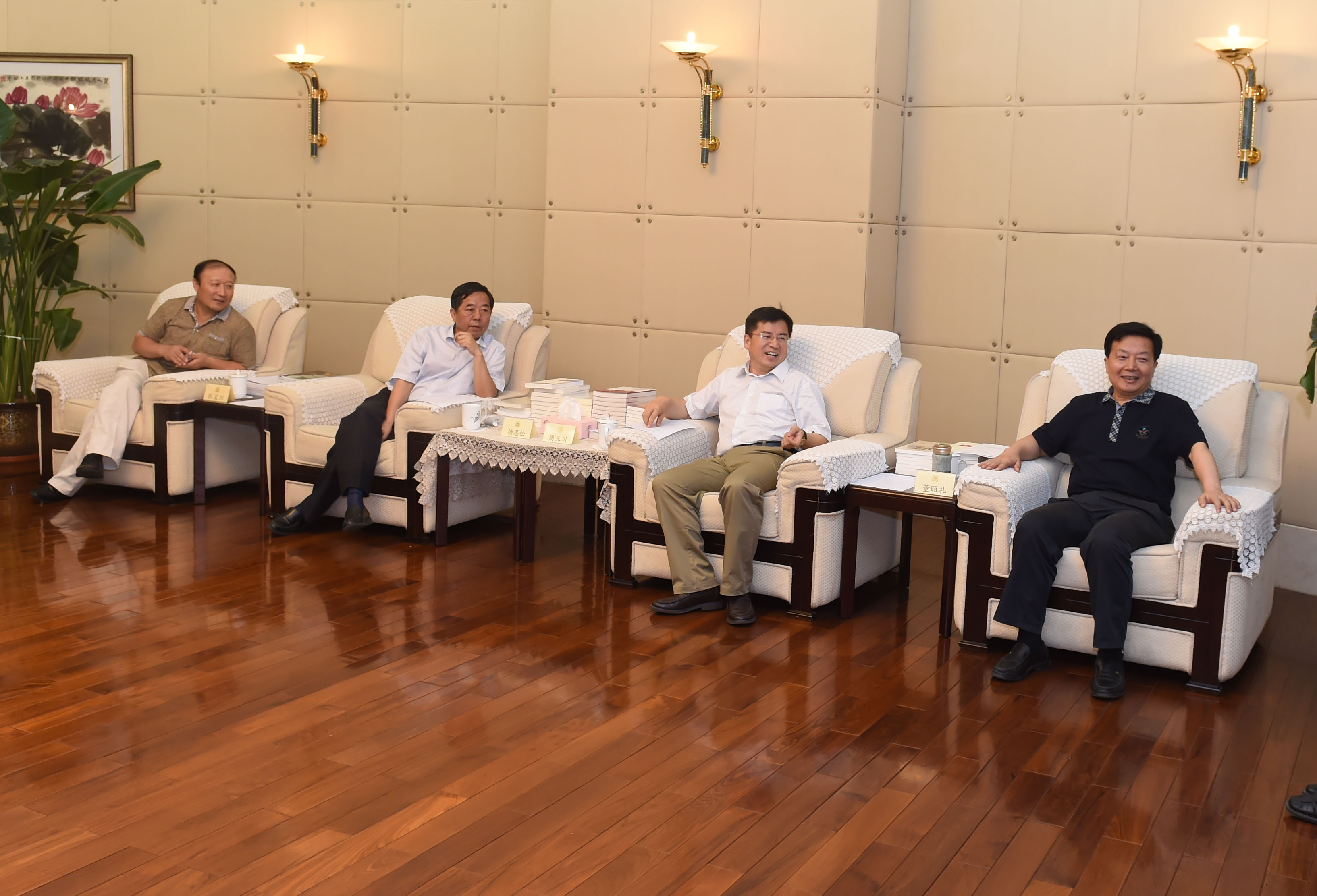 人民政协网北京6月24日电 合肥市政协主席杨思松(左二)、原主席董昭礼(右一)一行6月24日下午到访人民政协报社,就政协新闻信息宣传工作与人民政协报社党组书记、总编辑周北川(右二)、人民政协报社副总编辑张宝川(左一)等座谈交流。 人民政协网记者 姜贵东 摄