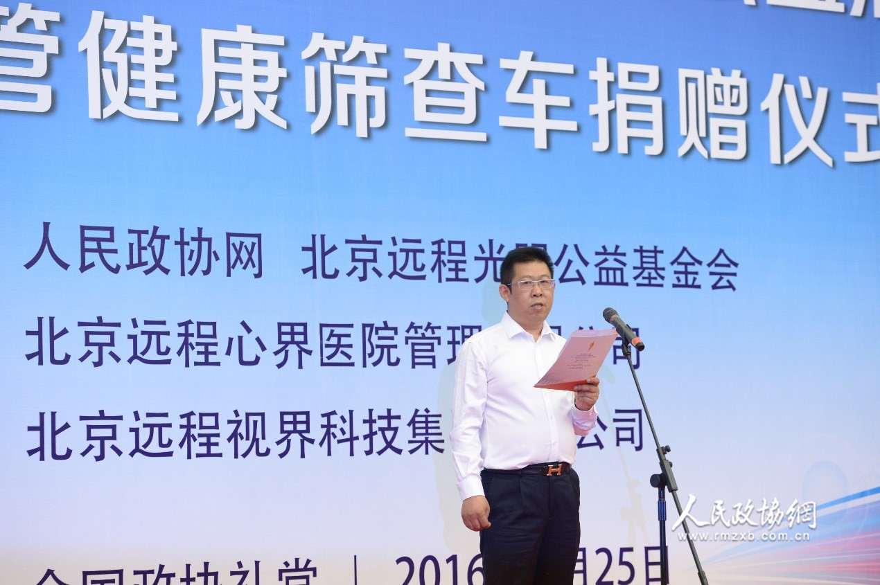 “全民健康促进工程”为全民,“全面健康促进工程”靠全民。做好这项惠泽群众的公益事业,需要社会各界的努力、坚持和付出,更离不开爱心人士和爱心企业的大力支持?;疃殖?,给予“全民健康促进工程”公益项目大力支持的爱心企业——北京远程视界科技集团有限公司副总裁尹和清在致辞时表示,善举创造和谐,爱心传承美德。捐车助医是一项功在当代、利在千秋的事业。作为全国最大的心血管病远程医疗运营机构,企业一贯秉持着“帮助老百姓解决看病难看病贵”问题的服务宗旨,充分发挥互联网技术优势和运营优势,并依托阜外医院的品牌与专家技术优势,将一流的专家诊疗技术服务送到基层。构建国家级、省级、市级三级远程专科会诊中心,实现县、乡、村三级专病防治健康管理初级保健网络体系,助力分级诊疗的实现。