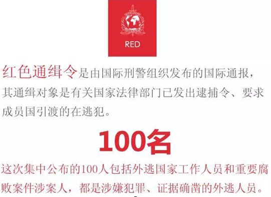 2015年4月22日,我国向全世界公布了一份红色通缉令,对100名外逃的国家工作人员、重要腐败案件涉案人等公开曝光,展开全球通缉。
