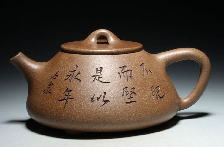 文人参与紫砂的另一主要方面即陶刻装饰,历来一直有“字随壶传,壶随字贵”的称颂。我一直认为文人题壶时,起题诗词、书画、镌刻应合理地布局到紫砂茶壶上,应该是“切茗”“切壶”的融合。如果装饰的内容与茶与壶不相关联,纯属壶上有了添加,有的更是画蛇添足糟蹋了茶壶的艺术性。当今有很多人对陶文化、茶文化不作研究,不考究诗句的来龙去脉,参与纯为挣钱。这就是顾景舟常说的用“萝卜”来煨“肉”,肉与萝卜一起烧,萝卜的味道好,其实得益于肉味。就算书画名家,如果不加思考在壶上作与茶与壶无关的笔墨装饰,这也只能是茶壶上留下了某某名人的笔迹。