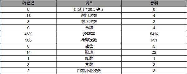 全场比赛,阿根廷18次攻门仅3次射正,智利4次攻门2次射正,两队均无建树。阿根廷的控球率为46%,智利则达到54%。