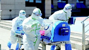 与会专家指出,重大传染病防控是一项系统工程,需要建立从病原监测到应急处置再到预防控制的整体救治体系。为提高批量传染病病人收治能力,优化收治程序,论坛期间,302医院还组织开展了“生物盾牌——2016烈性呼吸道传染病病人批量收治演练”,图为演练现场医护人员紧急转运烈性呼传染病重症患者。