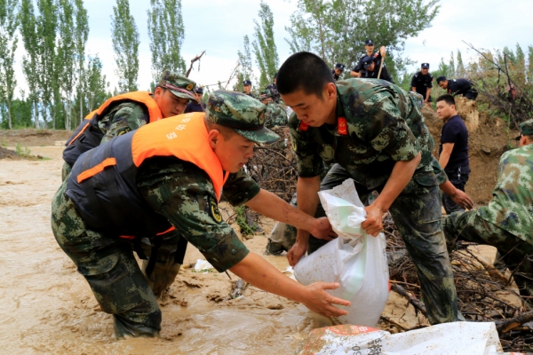 当日,新疆博尔塔拉蒙古自治州出现暴雨天气,降雨引发洪水,州首府博乐市小营盘镇塔翁哈木尔村一处防洪堤坝被冲毁,100余名村民遭到洪水围困。险情发生后,小营盘边防派出所紧急组织抢险队伍,封堵决口堤坝,帮助群众转移物品和牲畜。目前决口堤坝已被成功堵住,被困群众全部被安全转移。