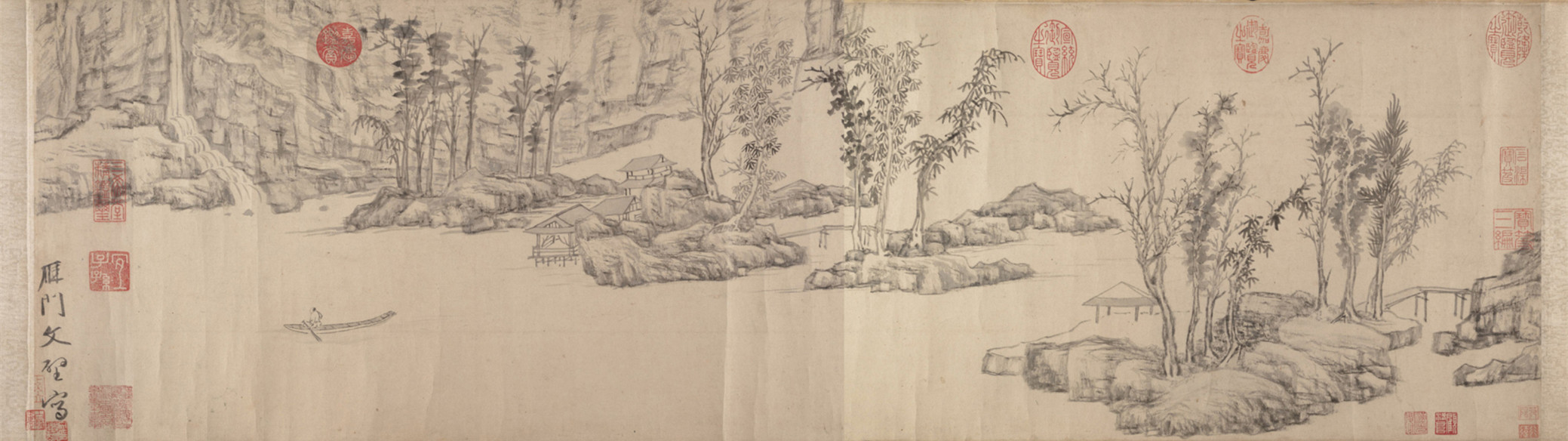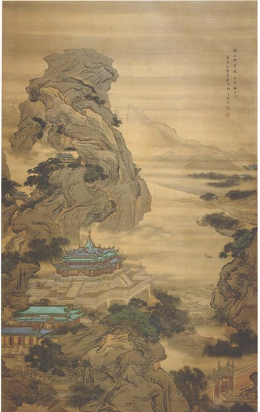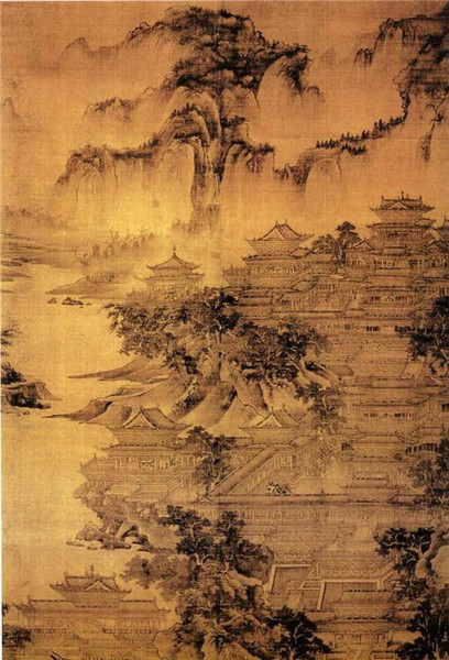 本幅无款识。对幅清代乾隆皇帝题诗。钤乾隆内府诸收藏印。《石渠宝笈》著录。此幅为清宫旧藏,是故宫博物院庋藏的几幅时代较早、传为唐人的绘画作品之一。乾隆题诗中有“九成琼殿叠,百道玉泉翻”句,认为此图写九成宫。事实上,画面描绘的是贵族出行和游乐的场面,繁密富丽,充满亭台殿阁,其间人物、鞍马、舟车往来。画法虽具大小李将军“金碧山水”传派的特点,实为南宋画家所作。虽然图上面描述贵族出行和游乐的场面,但身处山中,亭台楼阁,十分清凉。