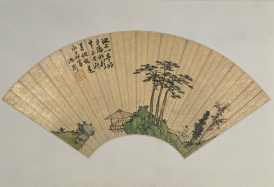扇页有自题:“池上一亭好,夕阳松影中。正无避暑地,认是水晶宫。沈周。”钤“启南”朱文印。图绘夕阳下,高士策杖至江亭避暑的小景。扇面构图为左右开合式,设色以绿色为主,其青翠明洁的色调与简约的景致相呼应。清爽、平淡的审美意趣与消除烦燥求得清凉的避暑主题相契合,烘托出远离市俗寻幽独行高士其清逸雅淡的心境。