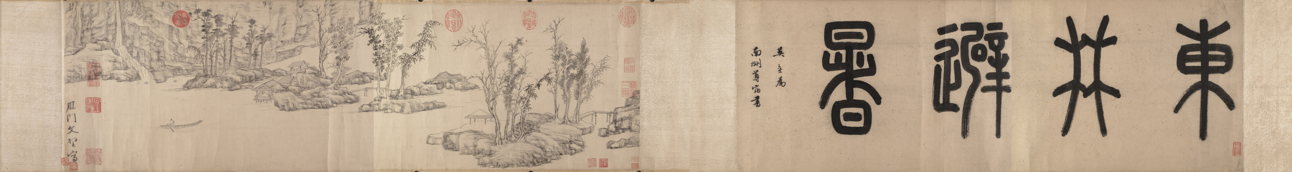 本幅行书自题七绝诗一首“短策轻衫烂漫游,暮春时节水西头。日长绿树青帏合,雨过遥山碧玉浮?!焙箢浴拔尼缑饔 薄ⅰ坝耥嗌椒俊庇?。右下角有“玉兰堂印”鉴藏印,画心有“世美堂印”、“马寒中印”等鉴藏印。裱边及外签有当代书画家狄葆贤(平子)题诗并记,钤藏印“平等阁主人”等。题记详述了此作原为其父于清同治末年购得、而他本人则在甲子年(1924年)夏六月重新装裱的递藏过程。