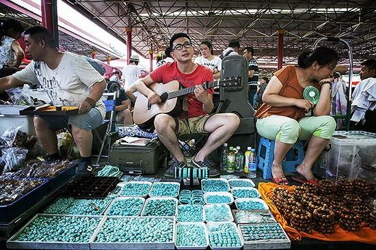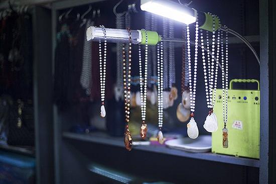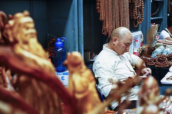 6月下旬的北京,地面温度近40度??抵樵缫严肮吡寺短焐唐痰亩闹?。在靠近市场东门的二区地摊上,她眯着眼睛,一边拿线串起带有图腾图案的黑白纹理的藏珠,一边和一个耄耋老者聊天。