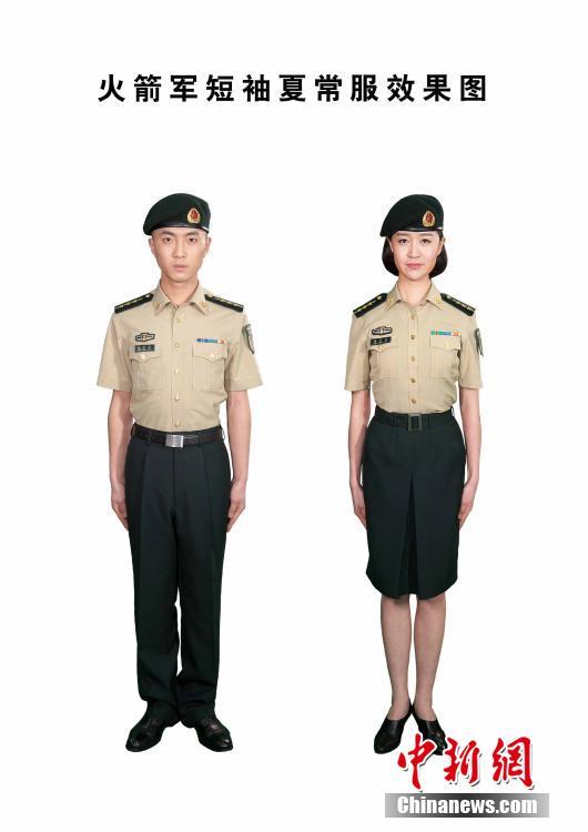 经中央军委批准,7月1日,火箭军官兵将正式启用穿着新式礼(常)服。据悉,火箭军新式服装采用了墨绿色和卡其色的邻近色组合,创新了军种服装色彩搭配方式,整体色彩集中、简单、精致;也自此实现了陆、海、空、火箭四大军种“两绿两蓝”的色彩格局。图为短袖夏常服。