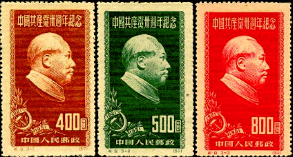 1951年7月1日,我国发行纪9《中国共产党30周年纪念邮票》,全套3枚。图案为毛泽东侧面浮雕像,以深色衬底。左下角装饰着橄榄叶和铁锤与镰刀相交叉组成的党徽图案。从1951年7月1日起,建党纪念邮票基本上每10年发行一套。