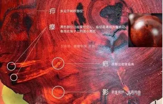 瘤:即瘿,树木因受到真菌或害虫的刺激,局部细胞增生而形成的瘤状物。有如人体的肿瘤。木料切开后呈现点状,通常把这种点状分布很密集的部分叫做“瘤疤花”如果很满很密集的话,通常叫“满花”或者“葡萄满架”,此类堪称极品,一般一面很满都极为难得。