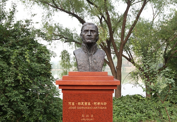 在北京朝阳公园国际名人雕塑园里,安放着由袁熙坤先生创作的玻利瓦尔、圣马丁、巴勃罗 ? 聂鲁达等十位拉美民族英雄雕像,及苏联飞鹰、甘地等名人雕塑,供民众怀念、瞻仰。今天,这里又增添了一位乌拉圭民族英雄“阿蒂加斯”,希望启发更多的人学习英雄们的先进思想和爱国情怀。
