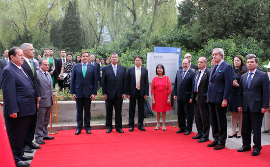乌拉圭外交部部长鲁道夫?宁?诺沃亚,全国政协常委、著名造型艺术家、北京金台艺术馆馆长袁熙坤,乌拉圭驻华大使费尔南多?卢格里斯,西班牙驻华大使,秘鲁驻华大使,哥伦比亚、阿根廷等近20个拉美等国家的大使,世界自然?;ち俗せ碇齑喝?,及各国驻华使官、社会各界人士出席了雕塑揭幕仪式。
