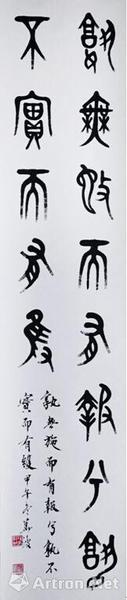 从以上列举《散氏盘》的几种风格拓展类型来看,以钟鼎文书法作为取法对象对篆书的学习和创作起到了不可替代的作用。钟鼎文的风格范型中,所具有的共同特征:中锋、圆笔、圆意流畅的笔法、线条意识构成了篆书作品审美的总格调。当代书法应该以审美风格为要旨,去创作钟鼎文书法作品,其评定标准是以具有独立的审美品格和高超豪迈的艺术境界,全新的创作思想和时代精神为标尺。无论是对古典范本技法范式的承传以及审美风格的拓展,还是个人独立笔墨语言,形式法则的表达,审美倾向的彰显,都应走向一流的艺术追求。