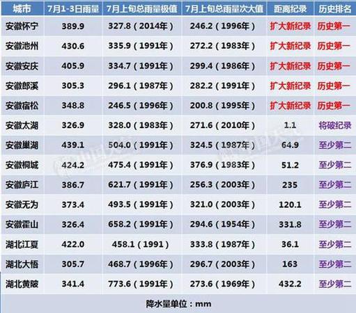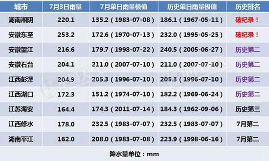 7月2日20时至3日20时,湖南湘阴,安徽东至降水量破单日历史纪录,安徽望江破7月单日纪录。另外,7月1日-3日累积降雨量,安徽怀宁,池州,安庆,郎溪,宿松都已经打破7月上旬(10天累积)总雨量纪录,未来两天,安徽太湖,巢湖,桐城,湖北江夏也很可能创下新的旬值纪录。