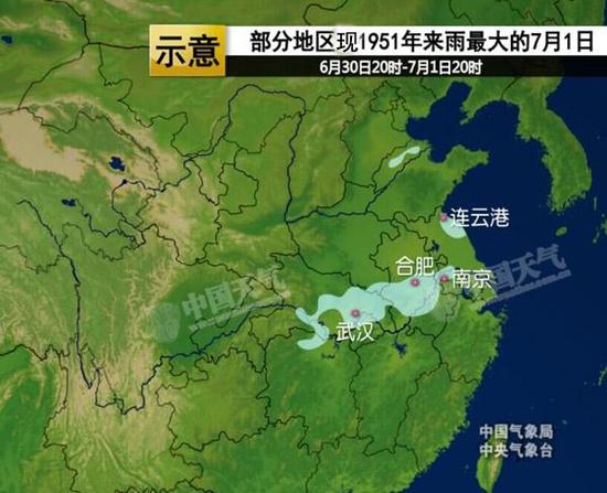 [截至1日20时]武汉合肥南京等地现1951年以来雨最大的7月1日