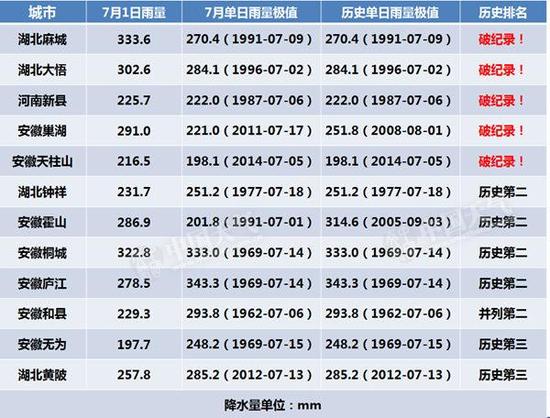 从6月30日20时到7月1日20时,湖北麻城和大悟的累计降雨量分别为 333.6毫米和302.6毫米,均打破历史单日雨量纪录;安徽巢湖和天柱山的累计降雨量分别为291毫米和216.5毫米,均打破历史单日雨量纪录;河南新县的累计雨量为225.7毫米,打破历史单日雨量纪录。湖北、安徽另有多地雨量接近历史纪录。