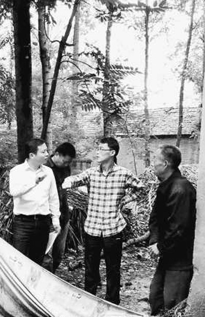 韩超(中)走访农户。资料图片