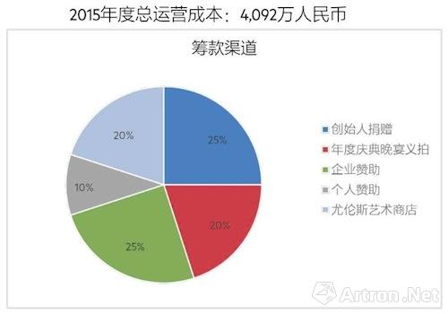 从尤伦斯当代艺术中心于去年年底公布的2015年总运营成本中可以看出它目前的运营状况。在去年其运营总共花费是4092万。这其中,资金的来源主要由创始人尤伦斯先生出资25%;企业赞助25%;每年尤伦斯当代艺术中心于年底举办的慈善义卖占20%;另外,艺术品商店的盈利占20%;还有10%则来自个人的赞助,即尤伦斯的理事会成员的赞助。