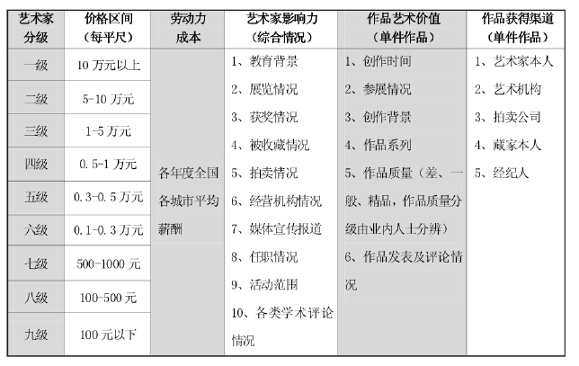 分级及价格区间,采集典型代表性艺术家的价格数据为基础,该价格综合艺术家的拍卖价、画廊价、藏家或经纪人间流通价、劳动力成本综合得出,作为参考数据。劳动力成本项,在前三级艺术家中可不进行参考,从第四级开始参考劳动力成本项,级别越低劳动力成本项的权重系数越大。