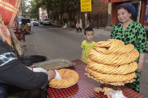 7月5日,再努拉大妈(前右)带着小外孙去购买馓子等面点。
