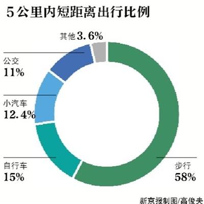 记者还注意到,在5公里以内适宜步行和自行车短距离出行中,步行比例为58%,自行车出行比例为15%,小汽车和公共交通出行比例分别为12.4%和11%,自行车出行比例还有进一步提高空间。34%的调查者称不骑车是因为出行距离过远,15%的人认为消耗体力,还有16%的人认为出行环境差。