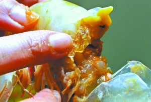既然知道注胶虾会以冰鲜、冻品出售,且在虾的头部注胶,消费者以后购买时要多留个心眼。如果在虾的头部发现有胶状物或虾头很鼓虾身捏不动,这种虾不要买不要吃。当然,如果非要吃冰鲜虾,那也请选择具备合法资质的商家、货比三家后购买。(文、图整理/记者 李光焱)
