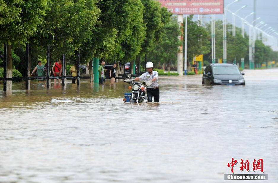 7月9日13时45分,今年第1号台风“尼伯特”以强热带风暴级在福建石狮沿海登陆,中心最大风力10级(25米/秒)。受其影响,福建中部沿海地区发生暴雨到大暴雨,局部特大暴雨,造成莆田、闽清、永泰等多地内涝严重。图为在莆田市区,民众推着电动自行车在水中前行。 中新社记者 吕明 摄