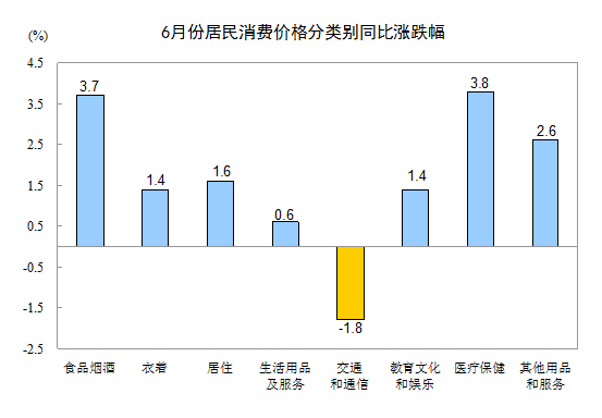 6月份,其他七大类价格同比六涨一降。其中,医疗保健、其他用品和服务、居住、衣着、教育文化和娱乐、生活用品及服务价格分别上涨3.8%、2.6%、1.6%、1.4%、1.4%、0.6%;交通和通信价格下降1.8%。