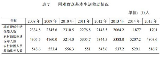 截至2015年底,全国救助供养农村特困人员516.7万人,比上年下降2.3%。全年各级财政共支出农村特困人员救助供养资金210.0亿元,比上年增长10.6%。其中:集中供养162.3万人,年平均供养标准为6025.7元/人,比上年增长12.2%;分散供养354.4万人,年平均供养标准为4490.1元/人,比上年增长12.1%。