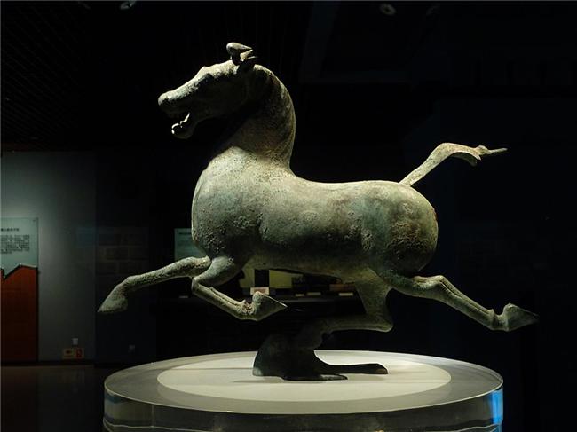 国宝级文物铜奔马的出土,背后就有这样一个故事。铜奔马,1969年9月,出土于武威雷台汉墓,整件器物高34.5厘米,身长40厘米,宽10厘米,重7.15公斤。这件铜奔马,展现了古代工匠们的高超技艺,他们巧妙地进行了设计,将马身全部重量集中在一只飞鸟身上,腾空的三足,既表达了奔马“疾风电驰”的速度,也充分保证了造型的稳定性。而奔马张口嘶鸣,昂首奔腾,似乎就是一匹正在奔跑中的天马。