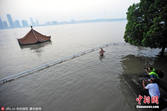 资料图:7月7日,湖北武汉,快要淹没顶子的武昌黄花矶长江亲水平台的亭子。