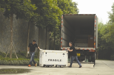 押运员将文物从车上卸下运往三星堆文物库房
