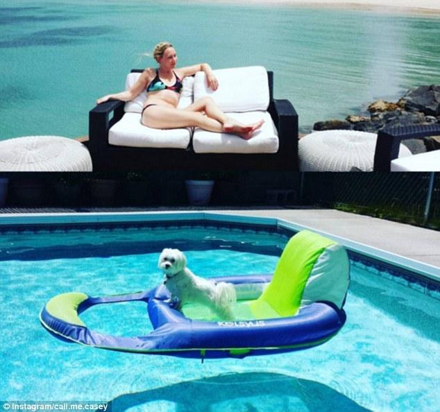 图为在泳池上漂浮游玩的马尔济斯犬。