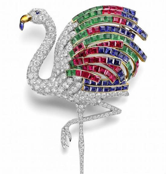 卡地亚曾在1940年为温莎公爵夫人制作了一枚构思精巧的火烈鸟胸针,这也令这个珠宝品牌于火烈鸟元素结下不解之缘,2010年这枚胸针在苏富比拍卖,拍出172英镑高价。
