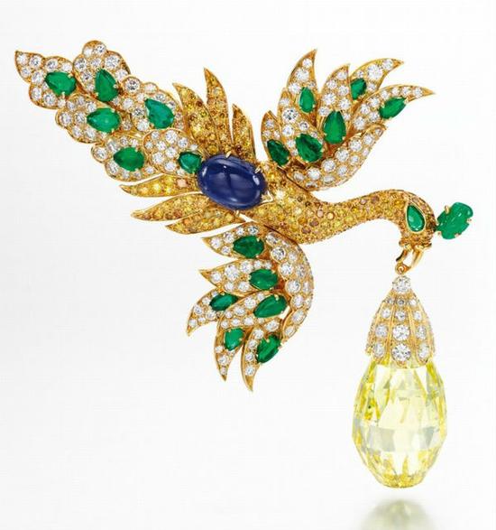 梵克雅宝这件惊艳世人的胸针于1971年创作完成,这枚疯狂叼着的是瓦拉斯卡皮奥赖特型钻石,这是一枚精美绝伦的泪滴形切割黄钻,重达96.62克拉,此前一直是二十世纪30年代波兰歌剧女高音与珠宝鉴赏家嘎纳·瓦拉斯卡(Ganna Walska)的珍藏之物。