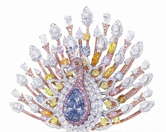Graff最具代表性的一件珠宝作品就是这件孔雀胸针,这枚精美绝伦的胸针堪称旷世之作,高约10厘米,合共镶嵌120.81克拉顶级美钻,价值1亿美元。胸针中央是一颗重20.02克拉的深彩蓝色梨形钻石,世间罕有。正中的位置和浓艳的色彩,自然成为最优雅夺目的焦点。