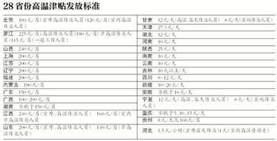 28个公开高温津贴标准的省份中,广东省目前执行的高温津贴标准为2007年制定,规定高温津贴在6-10月发放,每月150元。河南省10元/天的高温津贴标准则是从2008年沿用至今。