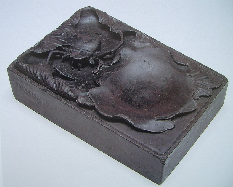 荷塘晚秋图,灵龟嬉游趣。陈端友琢仿生砚不计工时,52载仅制砚50余方,有瓜砚、蕈砚、猿砚、蚕砚、镜砚、笋砚、钟砚、象砚、鼠砚、虎砚、马砚、猫砚、螺蛳砚、蕉叶砚、竹节砚、鲤鱼砚、铜壶砚、蟾蜍砚、螭虎砚、钟鼎砚、古钱砚、松菌砚、田螺砚等等,代表作“九龟荷叶砚”、“枯竹澄泥砚”、“海天浴日砚”、“太平有象砚”、“磨菇澄泥砚”等。西泠印社2011秋拍陈端友制太平有象纹端砚:长16厘米,宽11厘米,高3.2厘米,成交价1035万元。陈端友存世雕砚,徐小圃、余云岫各占一半;除此,甚少为人制砚。余氏所藏30方均捐赠上海博物馆;据《古名砚》《文玩萃珍》载:另有4方流散日本,1方为海外私人收藏,遗珍寥若星辰。1981年,上海博物馆为纪念陈端友诞辰90周年,博物馆工艺美术研究组编著、由《文物出版社》出版《陈端友刻砚艺术》?!敖谰藿?,精品难求!”