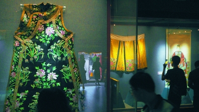 在女红巧技展区,展出了工艺精巧、形式丰富的刺绣艺术品,其中以清光绪时期的慈禧御笔松藤绶带鸟片为代表的刺绣作品,运用各种丰富多样的绣法,将书画中的笔墨线条、色彩浓淡和意态气韵表现得极其传神。
