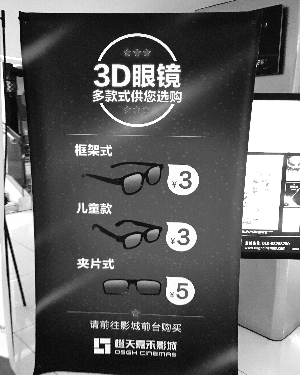 在橙天嘉禾影城万柳店,记者看到一块出售3D眼镜的告示牌。郭丹/摄