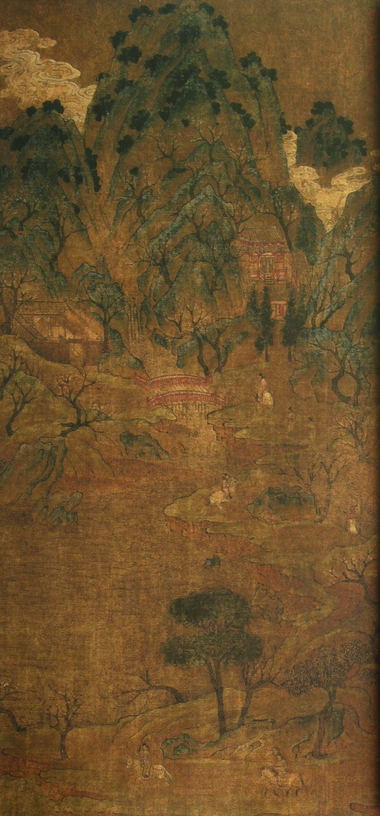 其次是建筑物中的斗拱、鸱尾与兽头。傅熹年运用古代建筑史料记载,将《游春图》描绘的建筑物上的斗拱特点与隋至唐末近三百年间的斗拱做法对照,得出它的时代不能早于晚唐,而与隋制相差甚远;同样,从古代建筑史发展中鸱尾的演变过程和文献记载来看,《游春图》中的鸱尾具有典型的北宋鸱尾特点,这一点又将《游春图》的时代上限下降到了北宋;兽头的对比得出的结论同样是不会早于北宋初或五代末年。以上的分析虽然不能完全断定此画准确的时代上限,但至少证明这幅《游春图》肯定非隋代之物,这对书画鉴定来说也是非常重要的贡献。