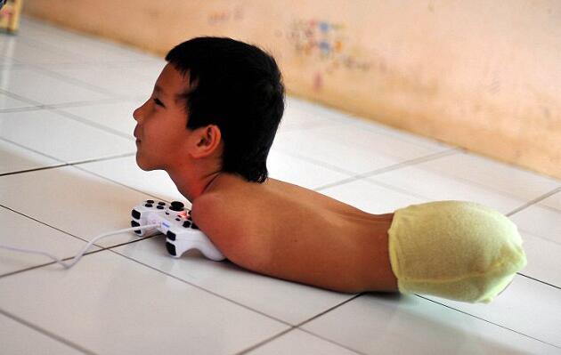 关键词:印尼无腿无臂男童 下巴玩游戏 用嘴写字