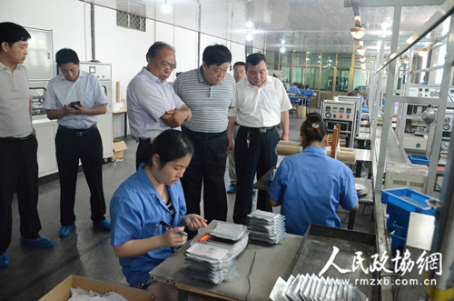 7月4日,河南省武陟县政协组织部分政协委员围绕产业优化升级进行视察,委员们针对企业发展瓶颈等问题建议:要加快发展步伐,在固有的基础上加大生产投入力度;要加大科技创新,吸收一批高质量的科技型人才,创新企业发展模式;要巩固现有市场,积极开拓西北地区及海外市场;政府要进一步加大对企业的支持力度,使其尽快发展壮大。图为在锂电池加工厂实地察看。李辰 摄影报道