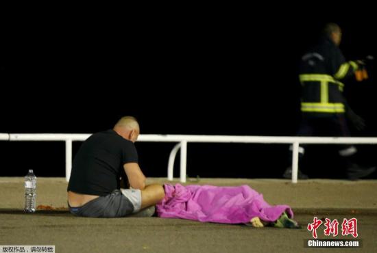 一名男子坐在一个遇难者遗体旁边。当地时间14日晚11时左右,数百人聚集在尼斯的海滨大道上观看法国国庆日烟花表演时,一辆白色的卡车冲进了人群,造成惨重伤亡。