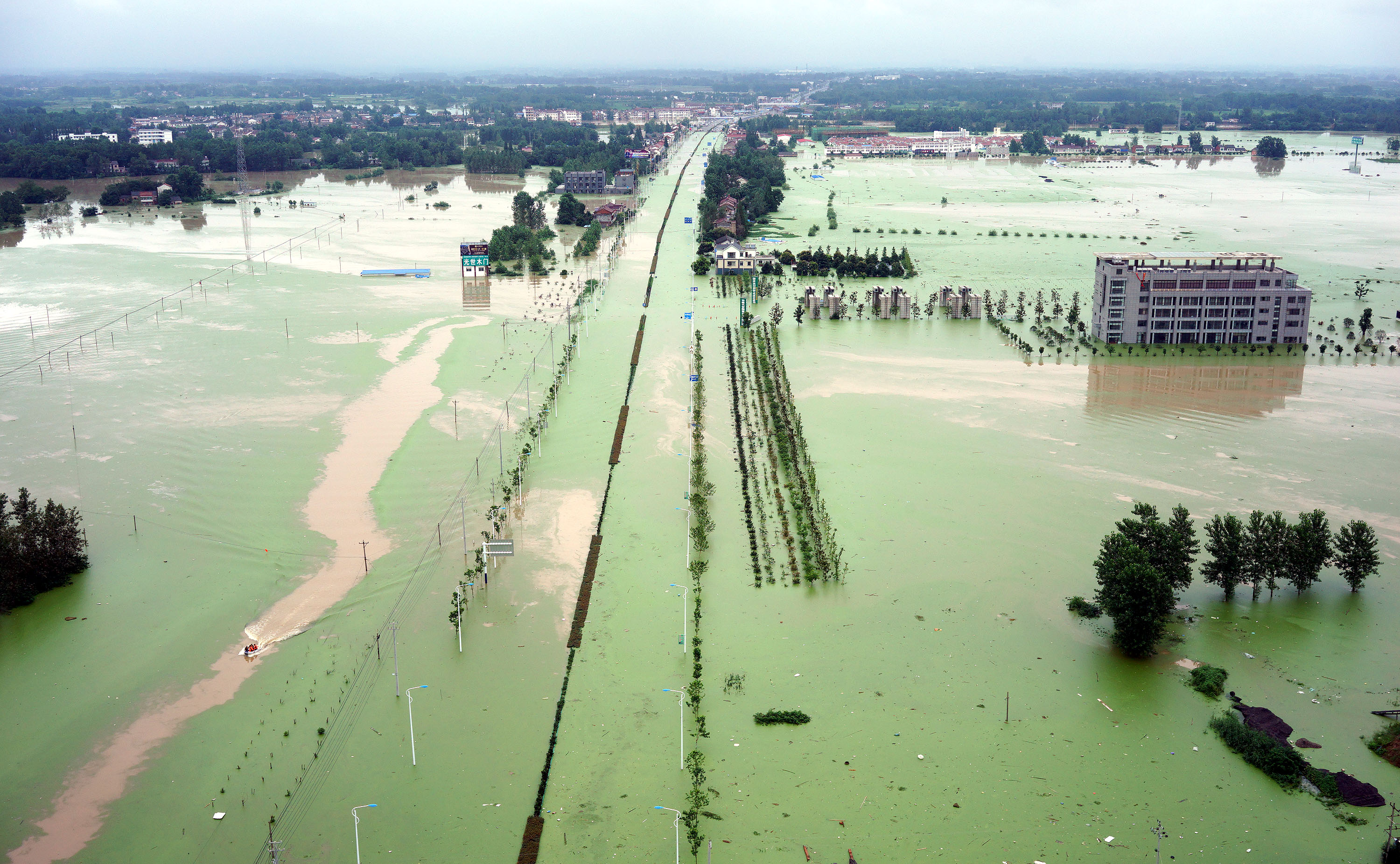 7月5日航拍的安徽省舒城县桃溪镇中断的206国道,这里平均水深达1.5米。新华社发
