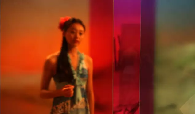 而到了《新女性2》的时候,我对新女性的定位是一种自我独立的空间。之所以叫做天色,天色即是梦中的颜色,梦中的颜色是一种五彩斑斓的感觉,而这种五彩斑斓就像是小的时候,我们大家用吃完水果糖的塑料糖纸照向天空的那一刹那,有一种光的颜色的变化和晕开的感觉。其实,每个女孩在自己的闺房里都有着自己视为宝贝一样的物品,它可能是一个日记本或者是件特殊的小礼物,而这些东西对她来说有着特殊的意义,我把这些东西称为存在自己的心里而留下了痕迹的颜色,而这种留下痕迹的颜色也是一种梦中的颜色?!缎屡?》是多屏彩色的一件作品,是用彩色的数字摄影机拍摄,这件作品更多的是关于女性个体在年轻时候的一种状态。