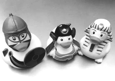 英国家庭的浴缸里往往漂着几只橡皮小黄鸭,小黄鸭成为承载很多英国人童年记忆的符号。1970年,歌手吉姆·汉森创作了流行歌曲《小黄鸭》,小黄鸭从此成为一种流行文化元素。大英博物馆推出了一套小黄鸭纪念品,萌萌的鸭子们或装扮成古埃及的狮身人面像斯芬克司、或头戴印第安人的羽毛头饰。装扮成古罗马战士的小黄鸭,黑色的上衣系着白色的排扣,下半身啤酒肚很是圆鼓;维京海盗小黄鸭那眼神、那表情仿佛在说:“金银细软统统拿出来!”……这些小黄鸭,间接展示了大英博物馆包罗万象的收藏品。