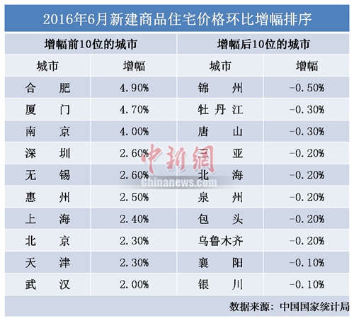 统计局数据显示,6月,70个大中城市中,合肥、厦门、南京、深圳等55城新房价格环比上涨,锦州、唐山、包头、北海、银川等10城环比下跌。这是房价上涨城市数量连续第二个月环比减少,也是去年11月份以来新房价格下降城市数量首次环比增多。